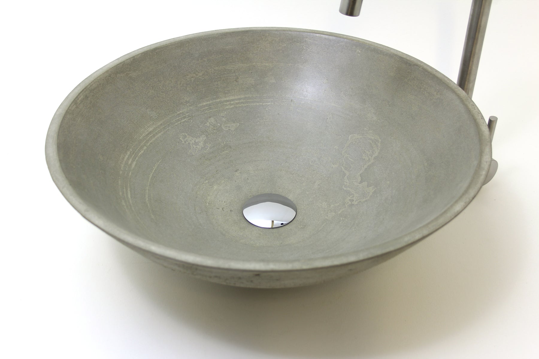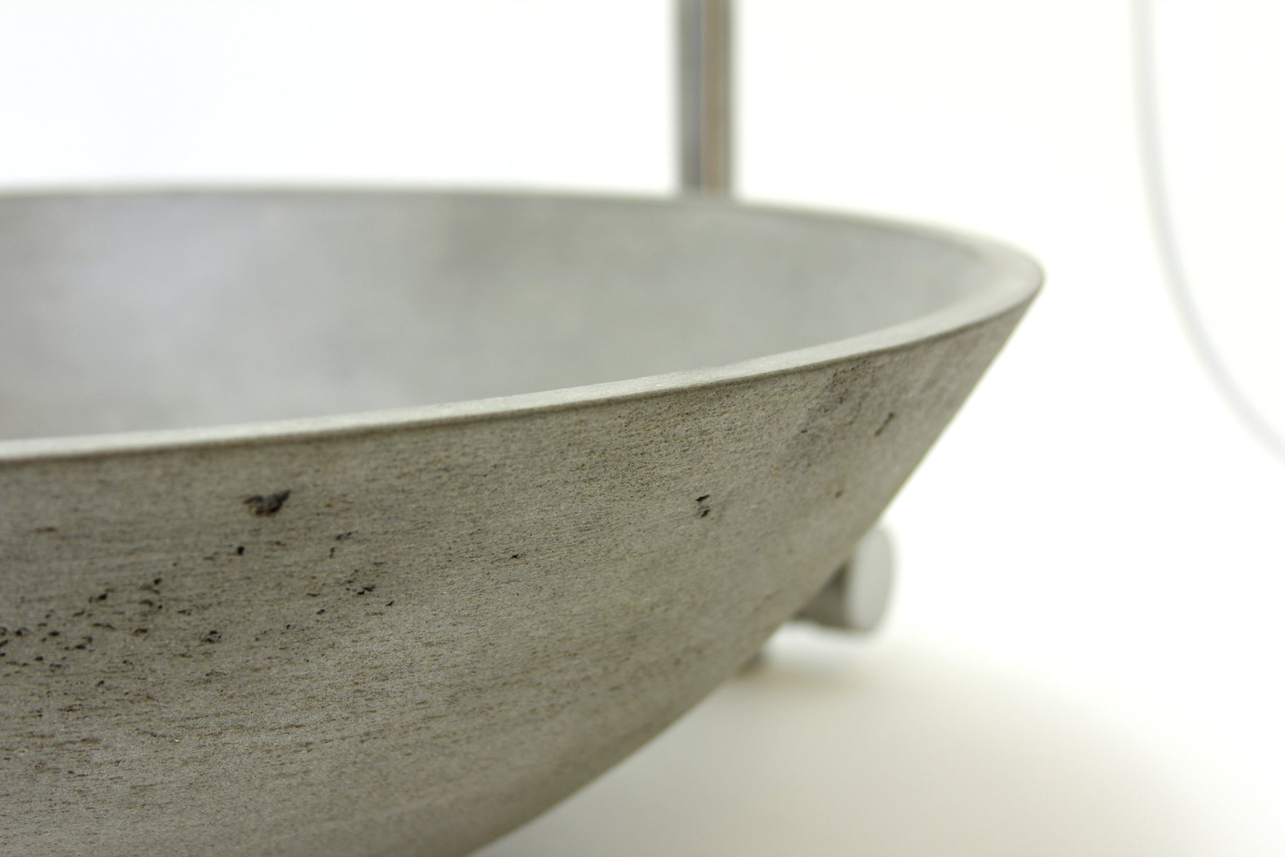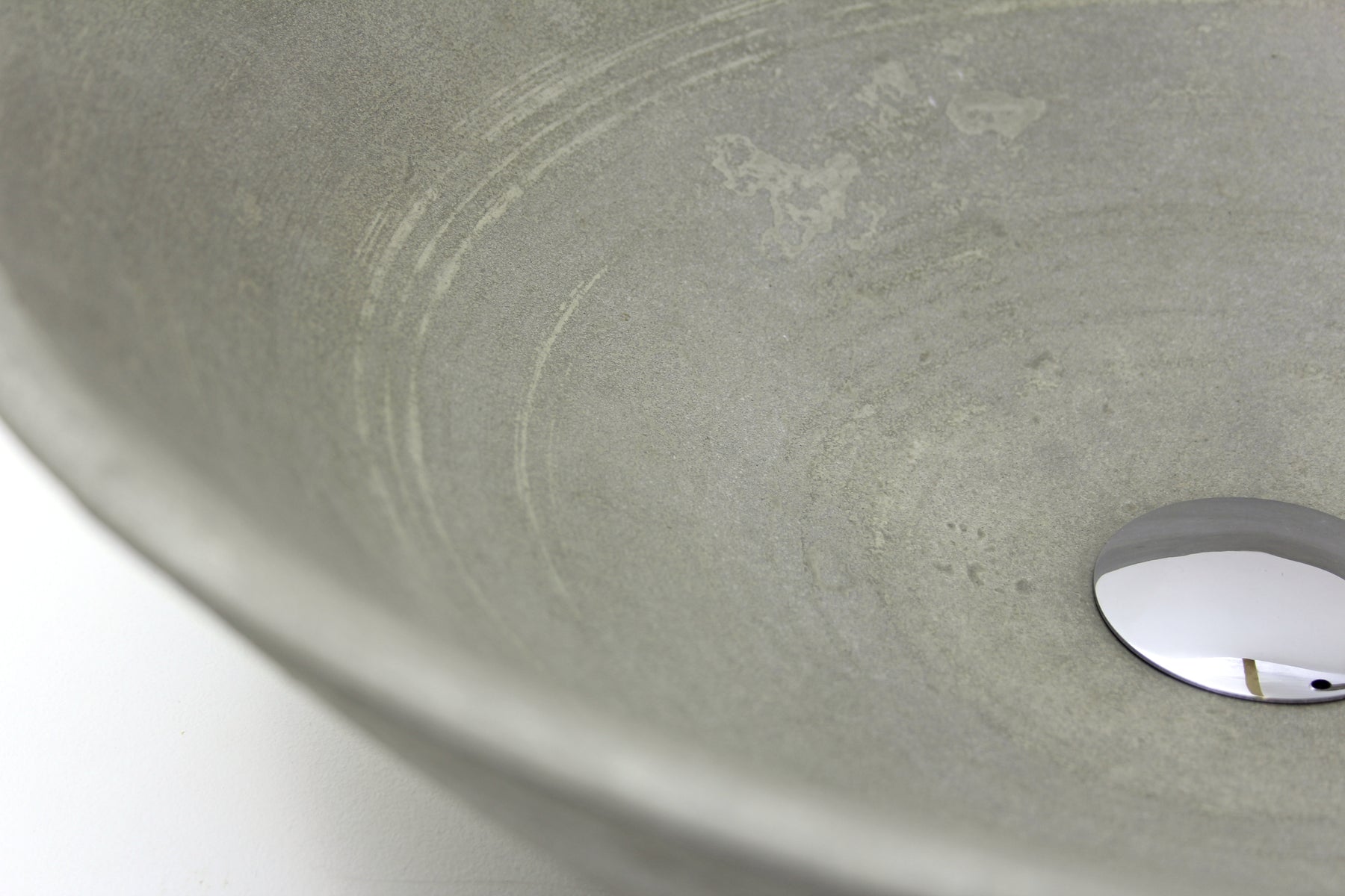 simple concrete basin in varying shades of Natural tone concrete forming unique lines and patterns on the inside and a sand textured, uniform surface outside.