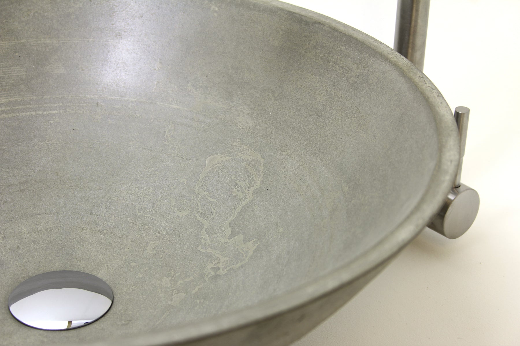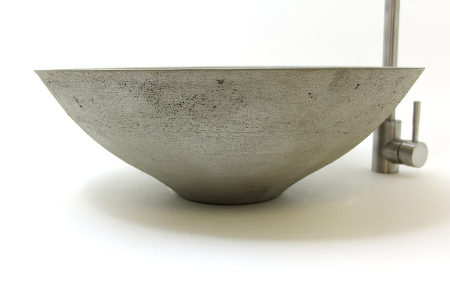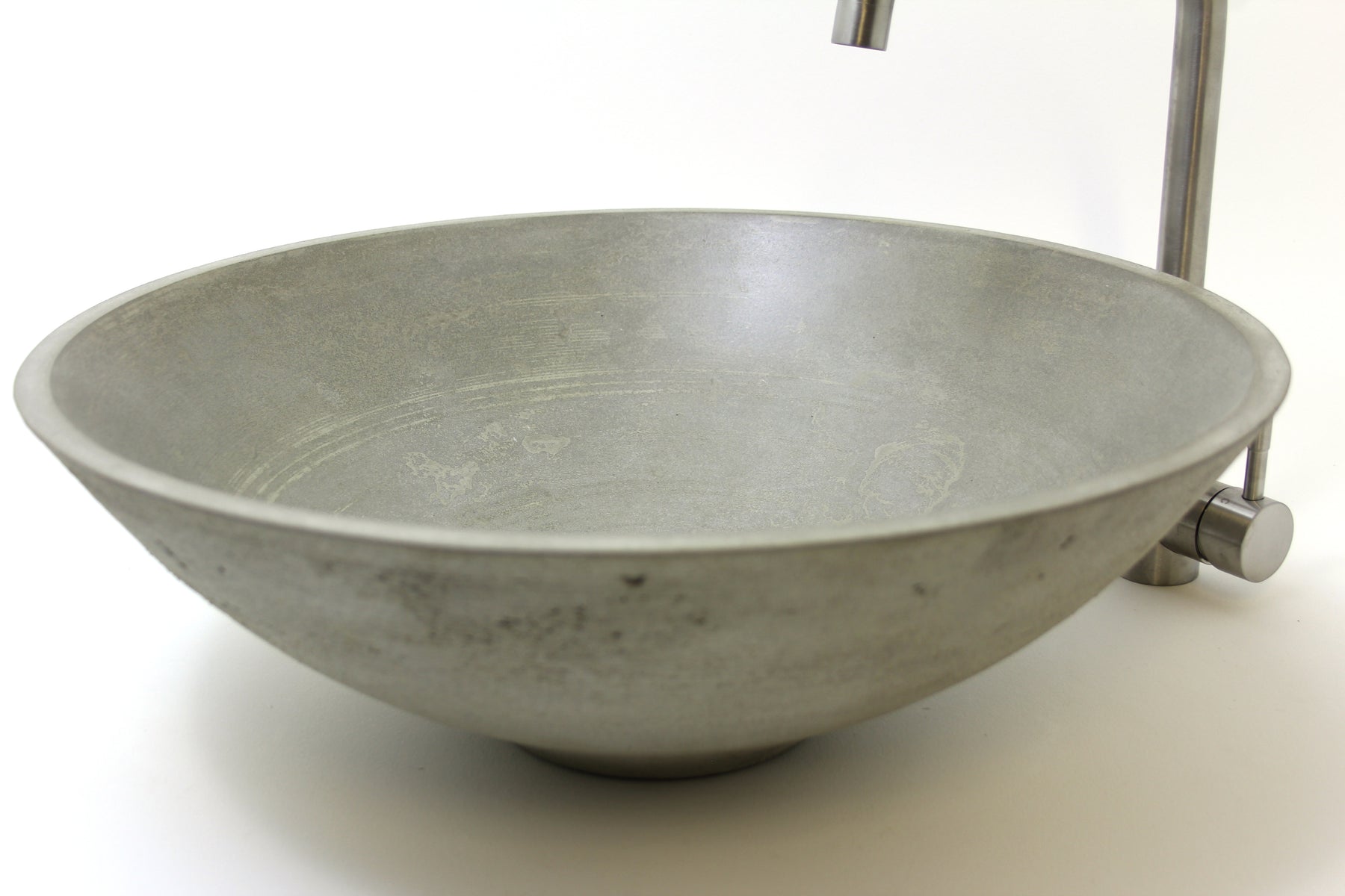 simple concrete basin in varying shades of Natural tone concrete forming unique lines and patterns on the inside and a sand textured, uniform surface outside.